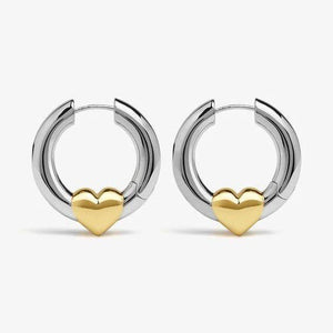 Two Tone Duo Tone Real Gold Dipped Heart Huggie Hoop Earrings, these earrings feature adorable heart huggie hoop earrings. Designs meticulously crafted from high-quality stainless steel with a radiant 18K gold finish. Their tarnish-free, hypoallergenic, and fade-resistant.