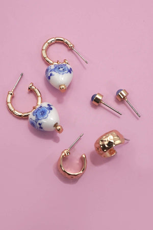 Blue Ceramic Porcelain Heart Drop Hammered Huggie and Stud Trio Hoop Earrings. Featuring a beautiful mix of blue ceramic porcelain toile pattern hearts and a hammered texture huggie with blue stone stud earrings. These earrings offer a bold yet refined look. The titanium posts ensure durability and hypoallergenic wear, making them suitable for sensitive ears. Hypoallergenic post Surgical steel post Lightweight post Durable post Product details: width: .5" - .35" length: 1.25" -.25" earring back: Titanium Post metal finish: gold Plating product: Lead & Nickel Compliant anti-tarnish: Double E-coating