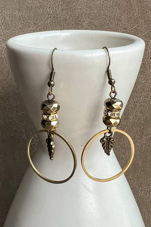 Fishhook earrings with metal circle charm, crystal beads and a feather charm. Length: 2"