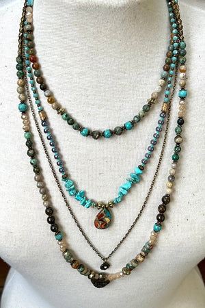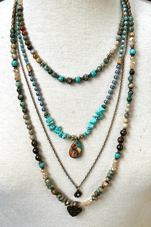 4 layer necklace with multi colored unique beading with a teardrop, flower and heart charm. Includes a lobster claw closure and 2" extension. Length of longest chain (when clasped on shortest link): 16"
