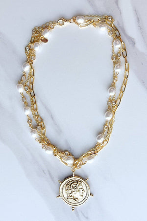 Triple layer chain necklace, all layers are attached! Large double-sided coin charm at bottom One layer features a gold paperclip chain. One layer features a pearl/rhinestone gem combo connected with dainty gold chains. One layer features dainty gold chain with rhinestone gems. Closes with a lobster claw clasp and a 2" extender. Measurements (when closed on the longest link): 12"