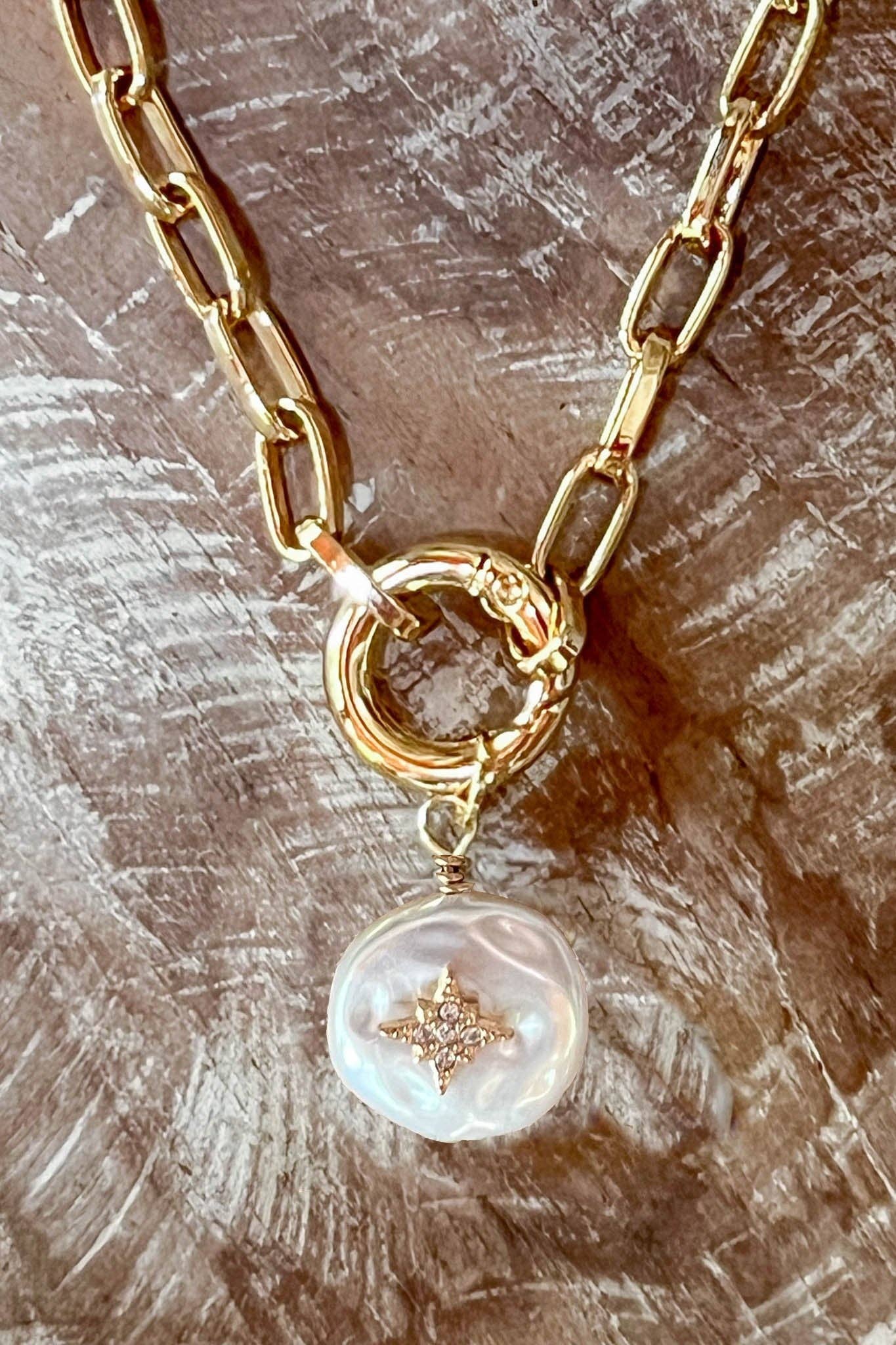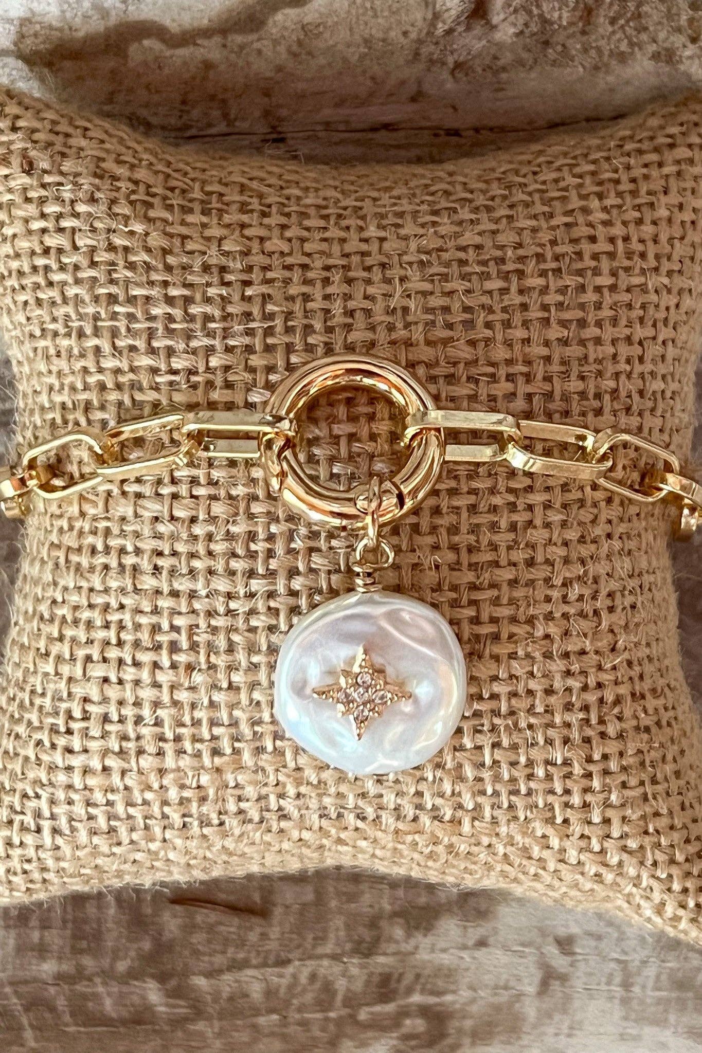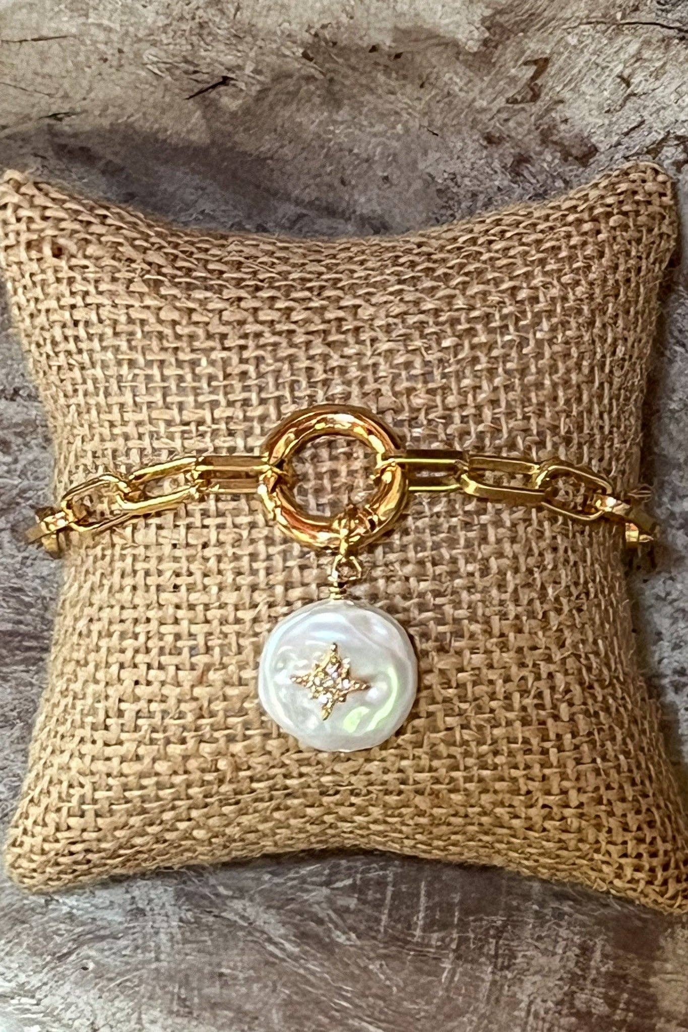 Single chain link bracelet with O Ring clasp that features pearl star charm. O Ring clasp opens/closes so additional charms can be added! Stretch Bracelet Diameter: 3.5"