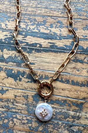 Chain link necklace with lobster claw and 2 inch extender. Features O Ring Clasp at bottom with pearl star charm. O Ring opens/closes so additional charms can be added! Length from top to bottom of charm: approx 9"