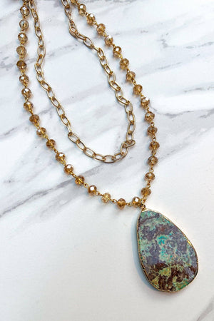 Double layer necklace featuring beautiful unique teardrop stone with gold soldering. Stone dangles from beaded chain layer, which features glass natural-toned beads. Second layer features gold chain link. Has lobster claw and 2 inch extender. **Please expect some variation in color/texture, specifically of stone, due to natural material. Length from top to bottom of stone(at longest length): 12" Length from top to bottom of shorter layer (at longest length): 9"