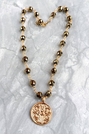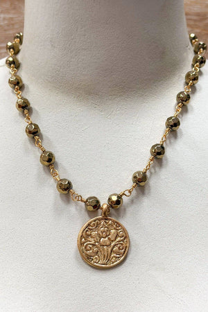 The Talus Gold Necklaces have gold faceted metallic beads with gold toned chain in between and a gold lobster claw with extender. There are 5 different styles of pendants. Star, Coin. Cross, Open Star, and Earth pendant. Length- 10"+ 2.5" extender