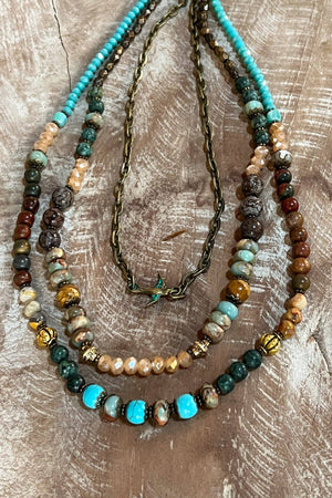 This unique piece of jewelry can be worn 5 different ways! The magnetic closure allows you to adjust this piece to your liking. You can wear it as one long necklace with the bottom piece being 3 layers of beautiful neutral beading. Take the top piece and wear it as a bracelet or a choker necklace. You can wear each piece separately or together to make a 4 layer necklace. Stones may vary in size and texture