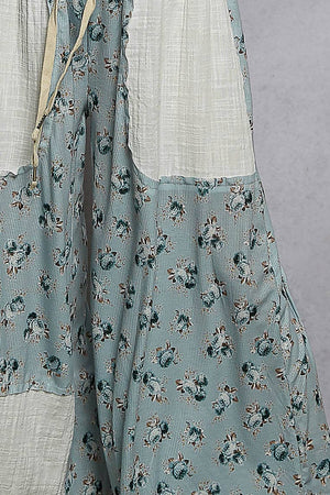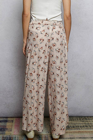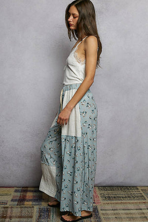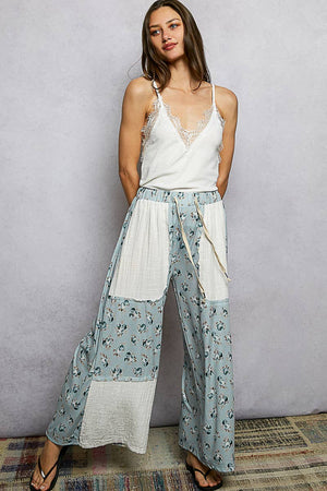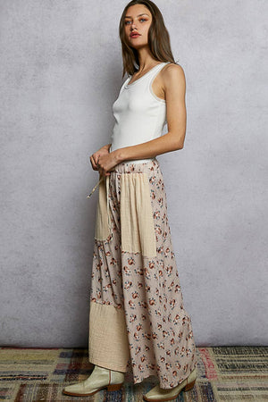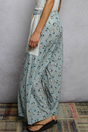 Designed in wide pants in printed rib with linen patch, out seam, normal washing, floral pattern.