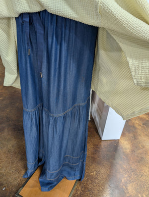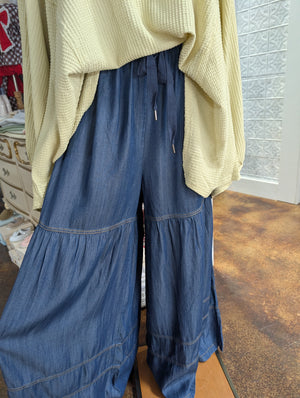 washed denim tiered wide leg pants featuring drawstring elastic waistband side pockets