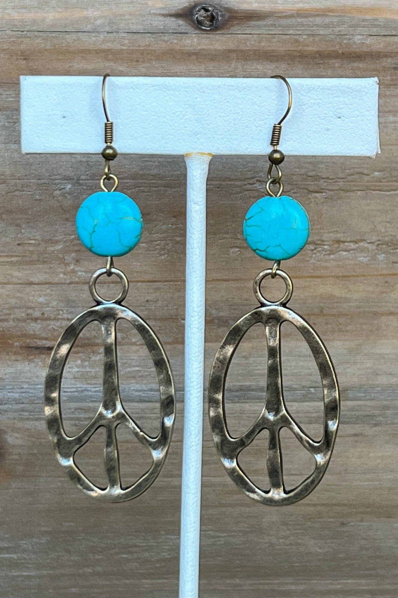 Bronze fishhook earring with a turquoise bead and peace sign charm length: 3"