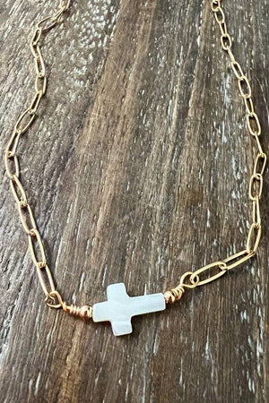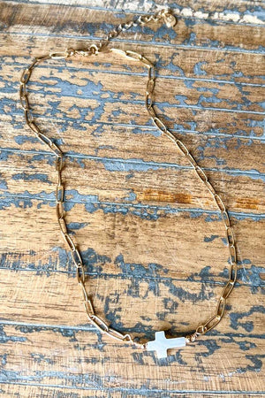 Single strand gold chain link necklace, 2 inch extender and lobster claw closure. Features white stone cross pendant Length: Approx. 8.5" Pairs perfectly with the Pria Bracelet (70304)