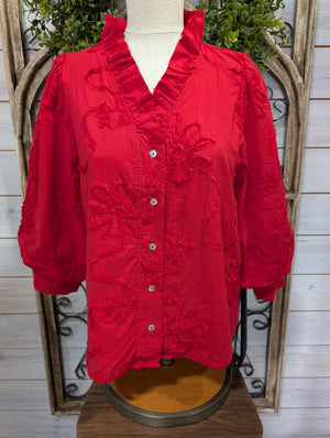 3/4 sleeves button down 3d floral top with textured fabric ruffled neckline
