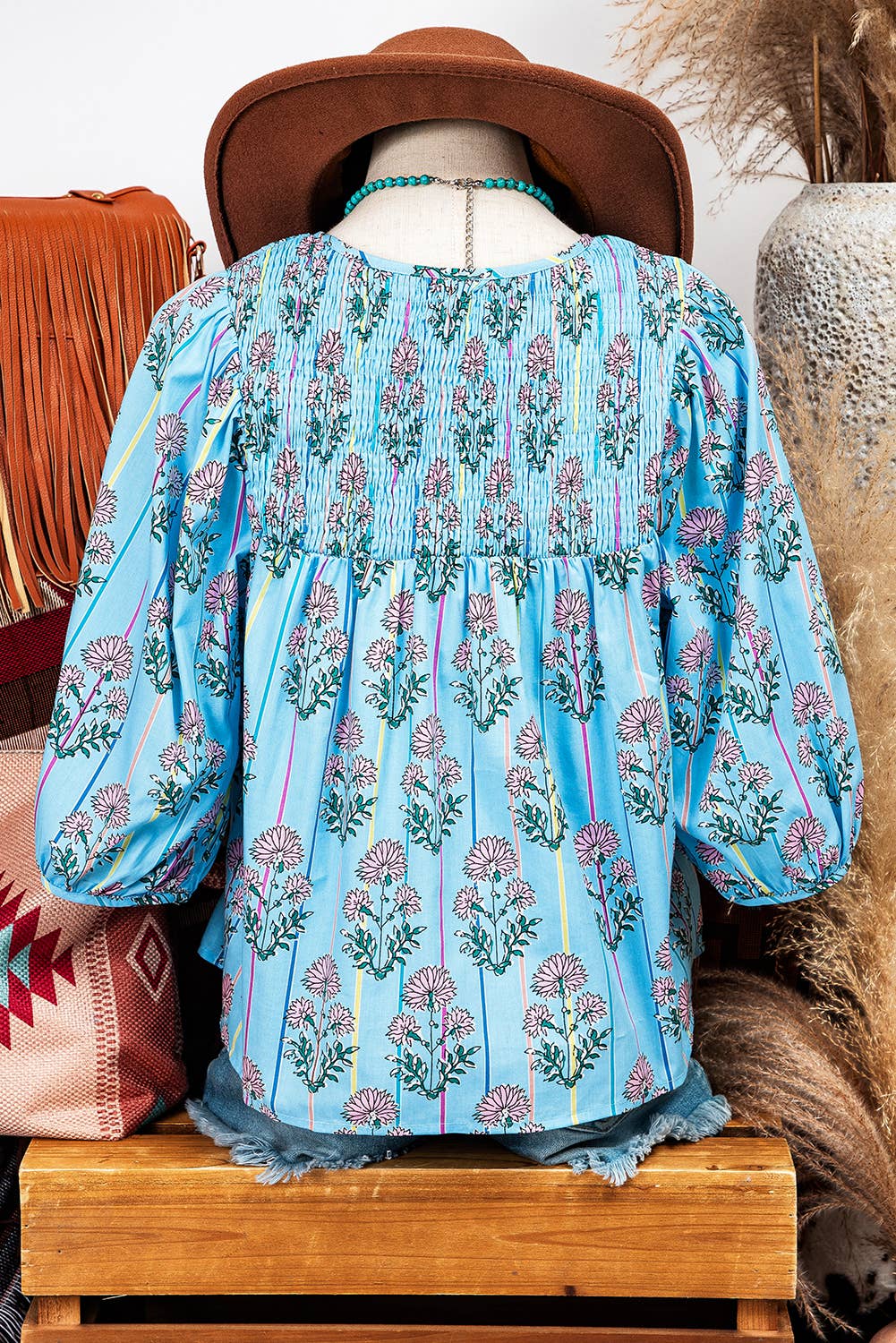 Fashion-W Floral Stripe Print Shirred Yoke Split Neck Blouse