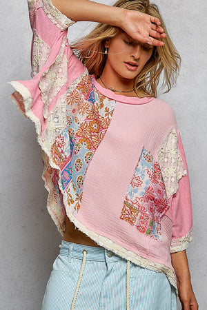 Designed in round neck, oversized fit top in double gauze with raw edge detail pointed floral pattern.