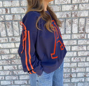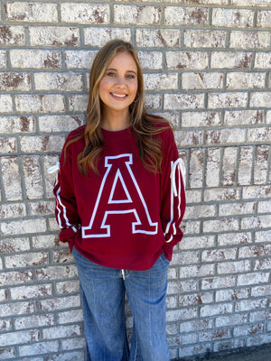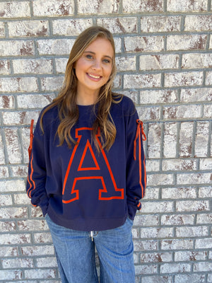 sweatshirt featuring a bold varsity style graphic A on the front and white ribbon tie details on the sleeves